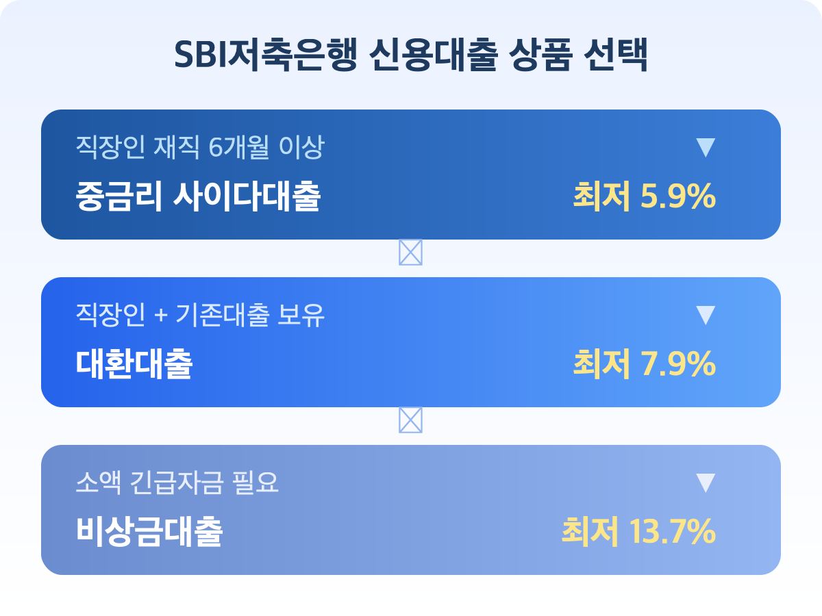 SBI저축은행 신용대출 4가지 상품의 금리·한도·자격조건을 비교 정리했습니다. 사이다뱅크 앱을 통한 비대면 신청 절차와 승인율 높이는 실전 팁까지 담았습니다.