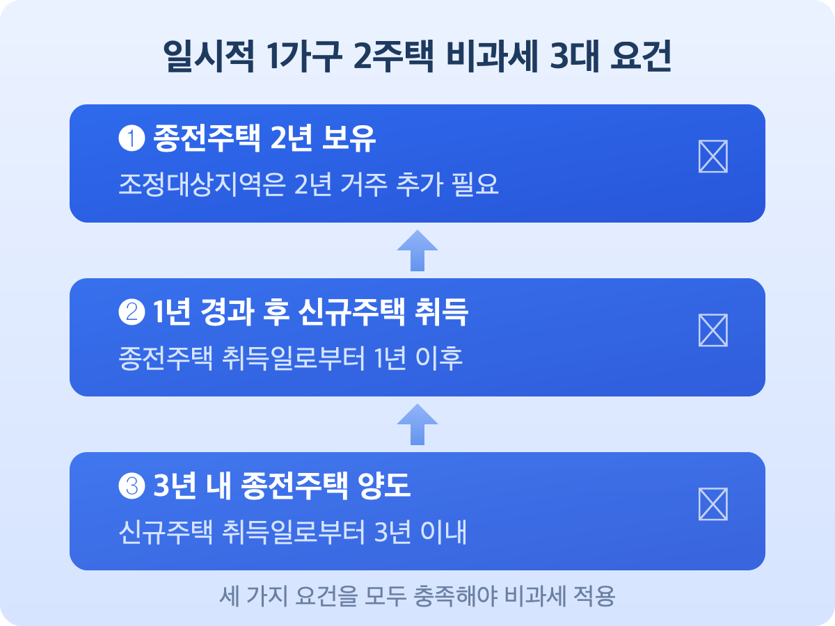 일시적 1가구 2주택 비과세 특례를 받으려면 3가지 핵심 요건을 반드시 충족해야 합니다. 2026년 최신 기준의 처분 기한, 조정대상지역 변화, 양도세·취득세 절세 전략까지 단계별로 안내합니다.
