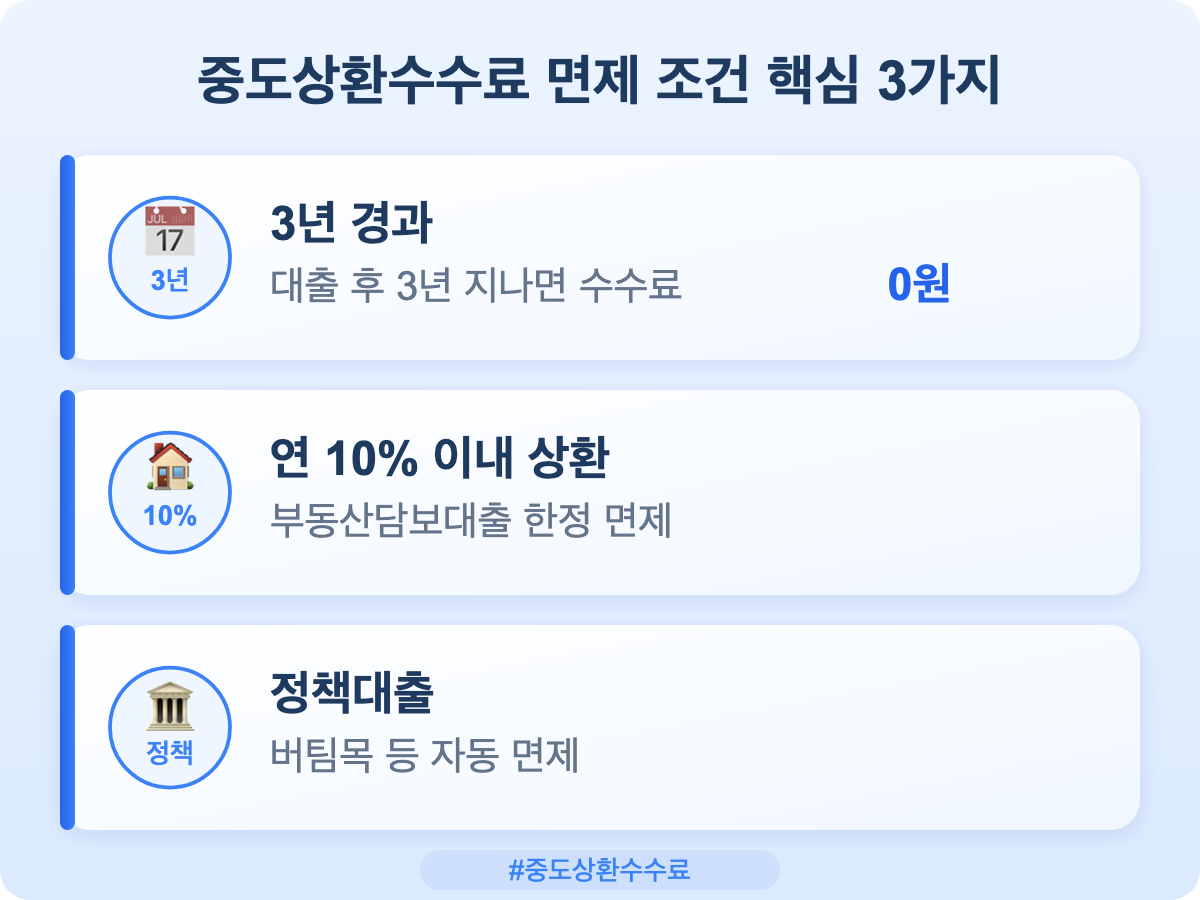 2025년 1월 제도 개편으로 중도상환수수료가 대폭 인하되었습니다. 주담대·신용대출·전세대출별 수수료율, 계산 공식, 면제 조건을 2026년 최신 기준으로 정리했습니다.