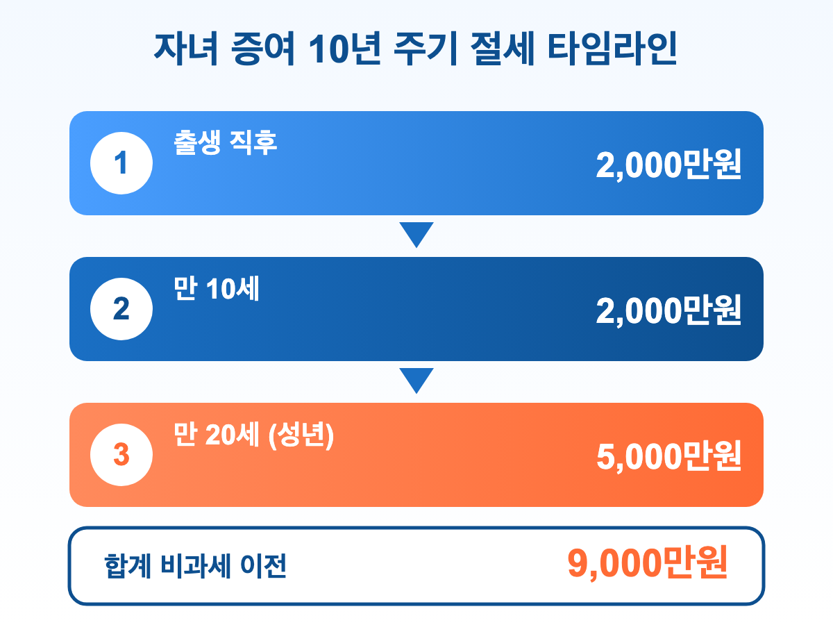 자녀 증여 10년 주기 절세 타임라인1출생 직후2,000만원2만 10세2,000만원3만 20세 (성년)5,000만원합계 비과세 이전9,000만원