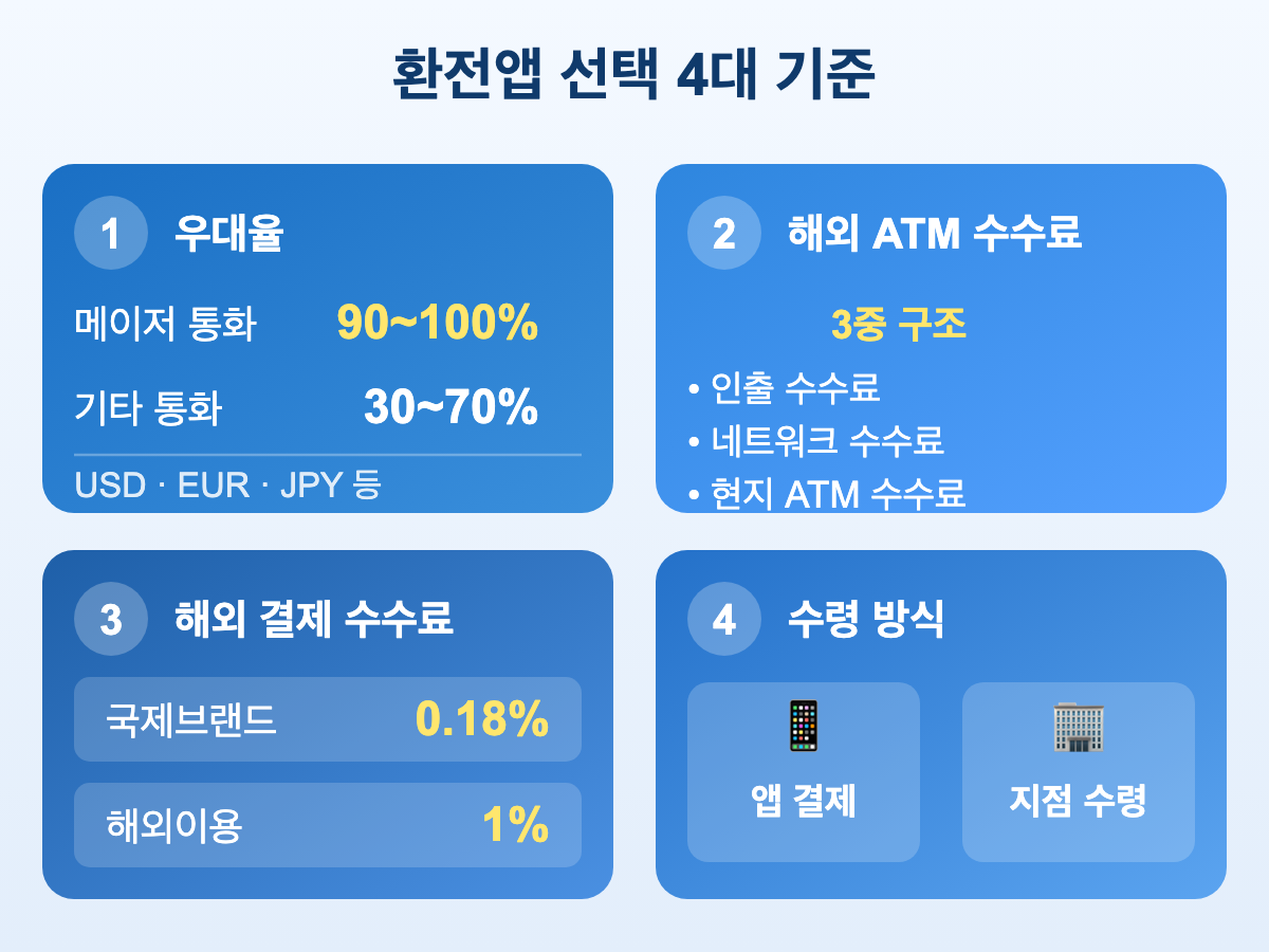 제가 직접 비교해 본 결과, 환율우대 환전앱 추천을 할 때는 최소 네 가지 축을 함께 봐야 합니다.