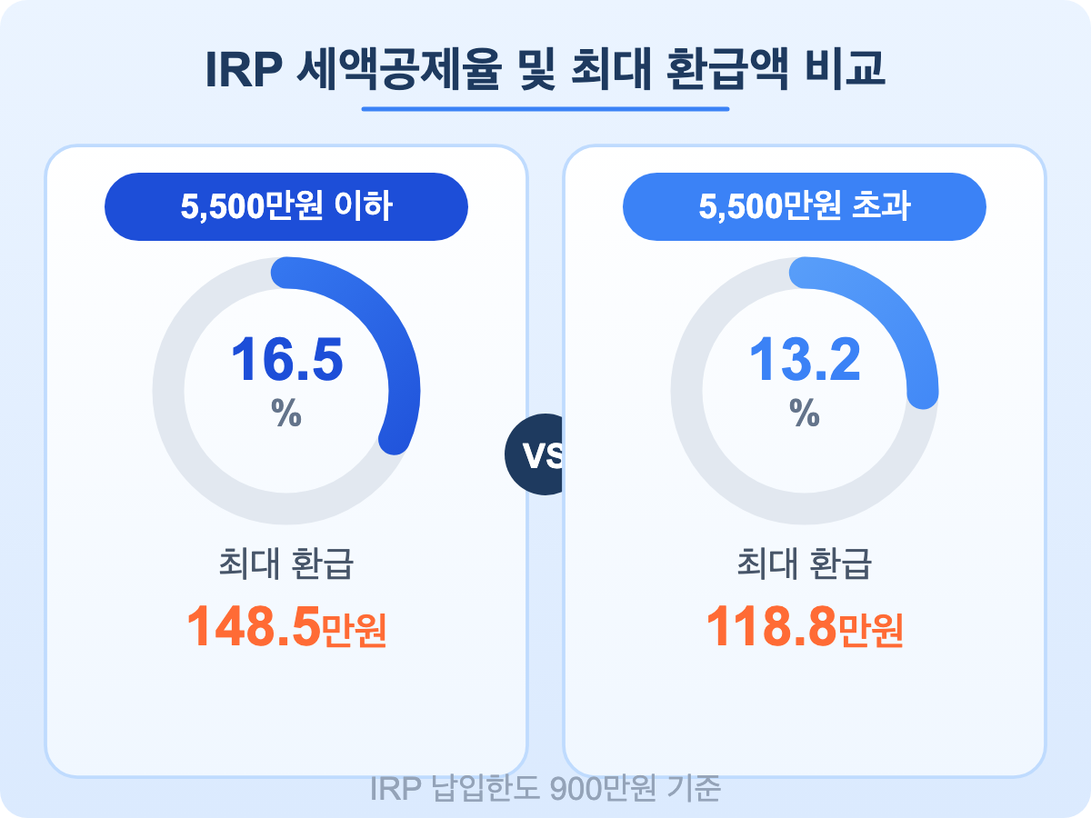 IRP 세액공제율 및 최대 환급액 비교5,500만원 이하16.5%최대 환급148.5만원VS5,500만원 초과13.2%최대 환급118.8만원IRP 납입한도 900만원 기준