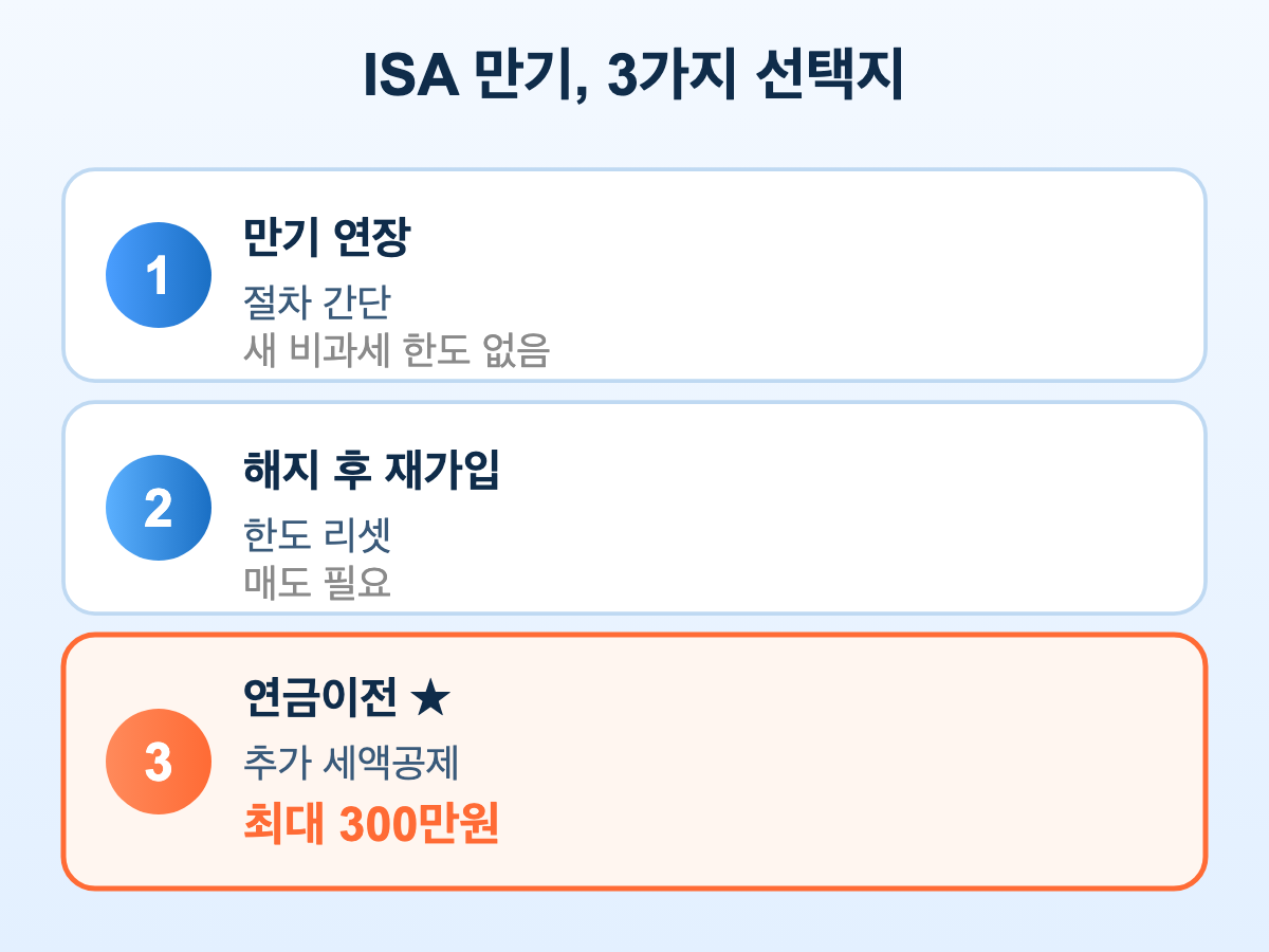 ISA는 의무가입기간 3년만 채우면 해지·연장·연금이전 세 갈래 길이 열립니다. 각자 상황에 따라 정답이 달라요.