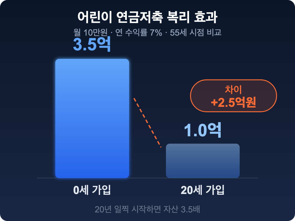 어린이 연금저축 복리 효과월 10만원 · 연 수익률 7% · 55세 시점 비교3.5억0세 가입1.0억20세 가입차이+2.5억원20년 일찍 시작하면 자산 3.5배