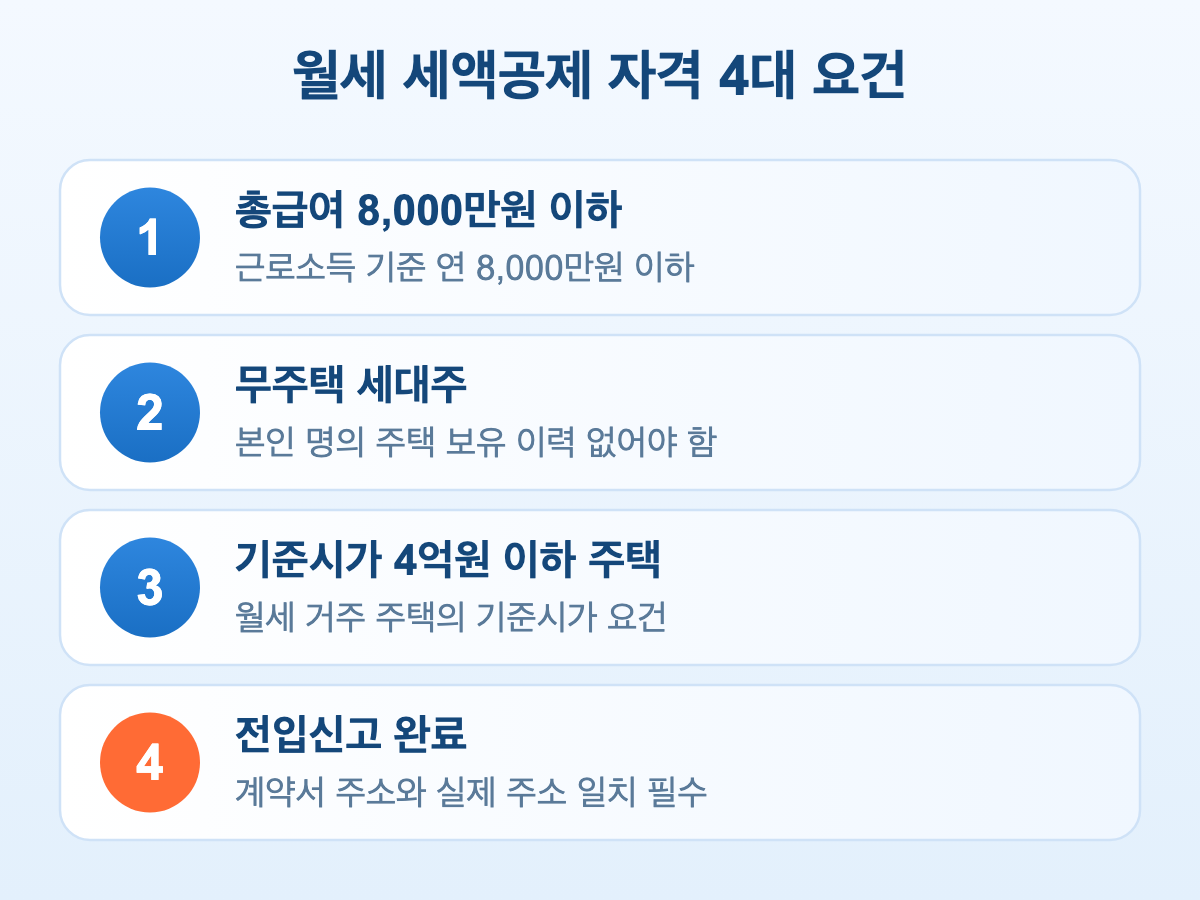 핵심 정리: 총급여 8천만원 이하 + 무주택 + 전입신고 + 기준시가 4억 이하. 네 개 다 충족해야 합니다.