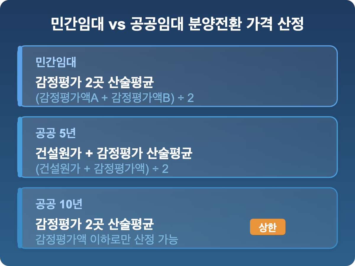 민간임대 분양전환 대상은 임대의무기간(8~10년) 완료 + 계속 거주 임차인입니다. 가격은 감정평가 2곳 산술평균으로 결정되며, 공공임대보다 시세에 가깝게 형성됩니다.