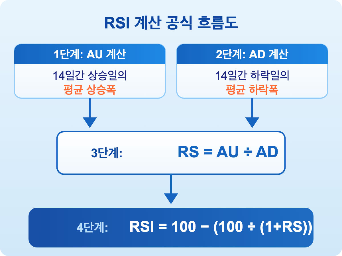 복잡해 보이지만 원리는 간단합니다. 일정 기간(기본 14일) 동안의 상승폭 평균과 하락폭 평균을 비교하는 것이 전부입니다.