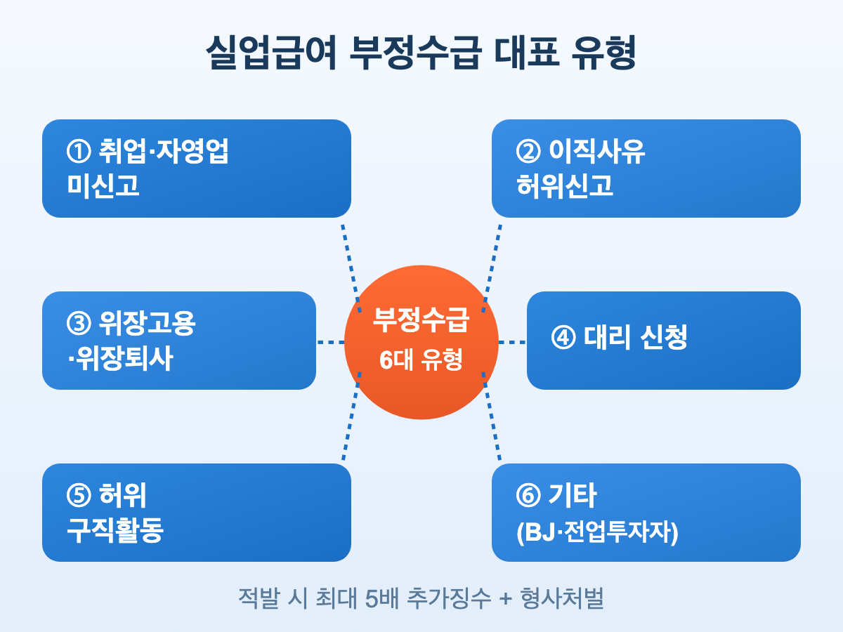 실업급여 부정수급 대표 유형부정수급6대 유형① 취업·자영업 미신고② 이직사유 허위신고③ 위장고용 ·위장퇴사④ 대리 신청⑤ 허위 구직활동⑥ 기타 (BJ·전업투자자)적발 시 최대 5배 추가징수 + 형사처벌