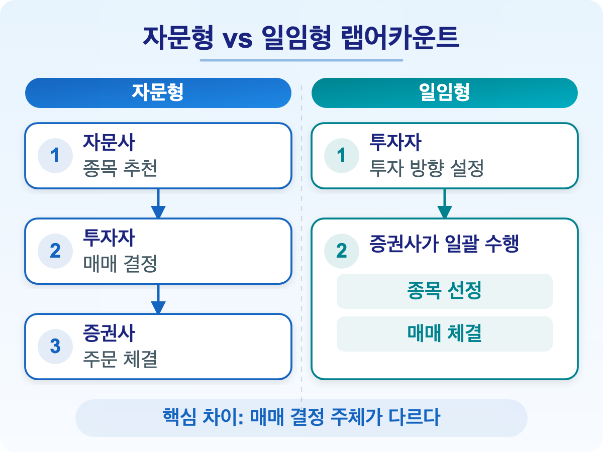 랩어카운트는 크게 자문형과 일임형으로 나뉩니다. 이 두 가지를 헷갈리면 가입 후 당황할 수 있으니, 차이를 확실히 잡고 가세요.